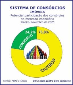 No segmento imobiliário, somente em onze meses de 2025, as contemplações representaram potenciais 24,2% de participação no total de 538,37 mil imóveis financiados, incluindo recursos das cadernetas do Sistema Brasileiro de Poupança e Empréstimo (SBPE) e os consórcios, potencialmente um imóvel a cada quatro comercializados.