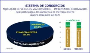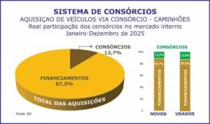 Na separação entre novos e usados, houve 12,3% de caminhões zero comercializados via consórcio e 87,7% por financiamentos. Os seminovos somaram 13,0% via Sistema de Consórcios, enquanto 87,0% foram por financiamentos.