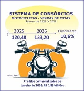 Presente em outros setores como o das duas rodas, o mecanismo também evoluiu. No primeiro mês de 2026, as contemplações possibilitaram a potencial aquisição de uma moto a cada três comercializadas no mercado interno.