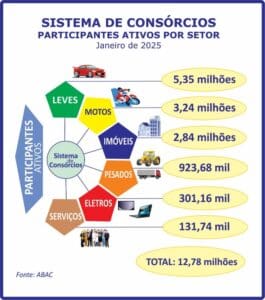 Em cada segmento no qual o consórcio está presente, dos 12,78 milhões de participantes ativos, o total ficou assim dividido: 5,35 milhões em veículos leves; 3,24 milhões em motocicletas; 2,84 milhões em imóveis; 923,68 mil em veículos pesados; 301,16 mil em eletroeletrônicos e outros bens móveis duráveis; e 131,74 mil em serviços.