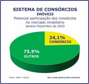 No segmento imobiliário, durante os doze meses de 2025, as contemplações representaram potenciais 24,1% de participação no total de 603,07 mil imóveis financiados, incluindo recursos das cadernetas do Sistema Brasileiro de Poupança e Empréstimo (SBPE) e dos consórcios, potencialmente um imóvel a cada quatro comercializados.