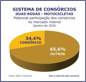 Presente em outros setores como o das duas rodas, o mecanismo também evoluiu. No primeiro mês de 2026, as contemplações possibilitaram a potencial aquisição de uma moto a cada três comercializadas no mercado interno.
